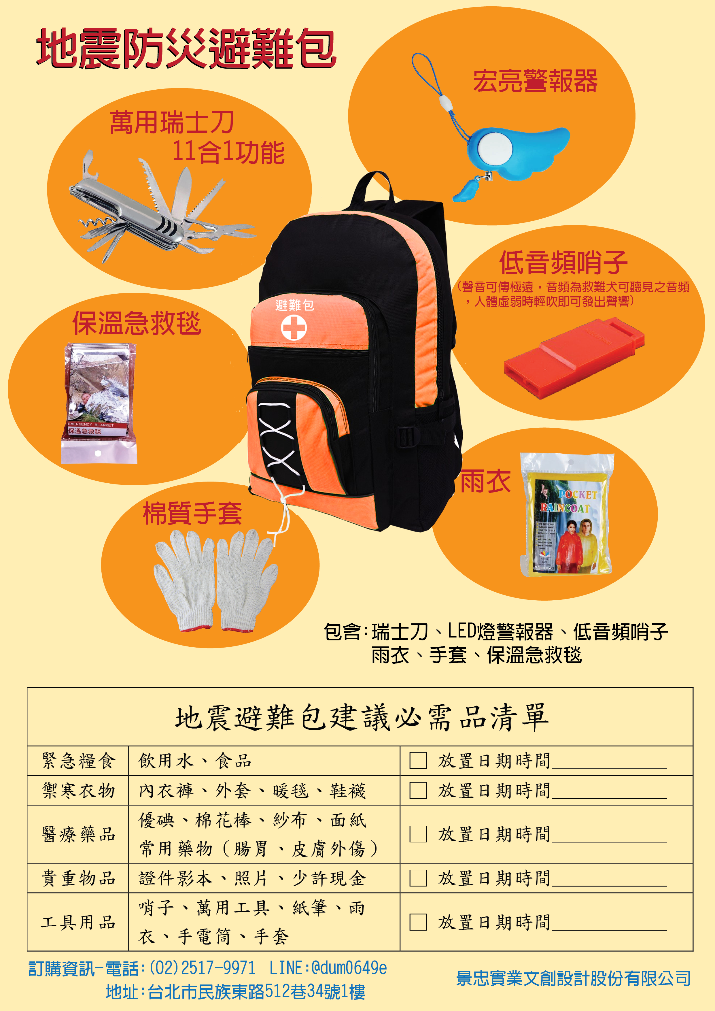 新產品:地震防災避難包為景忠實業股份有限公司於2018/02/08上市產品